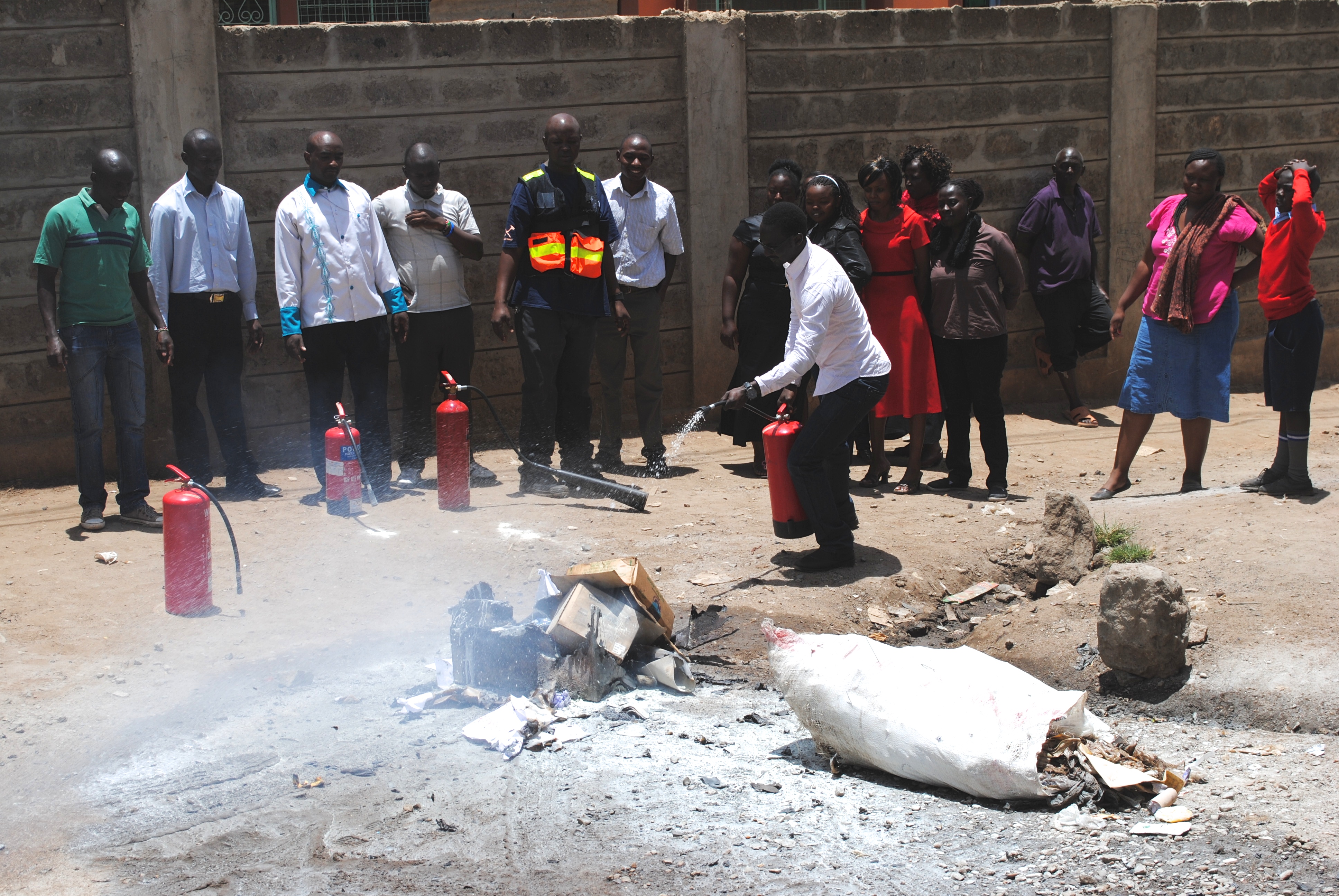 Last week, Missions of Hope International’s (MOHI) Community Health Evangelism (CHE) trainers and other staff members participated in a week-long fire safety and prevention training presented by the Nairobi County Fire Department. As part of the training, our staff learned how to use different types of fire extinguishers and applied their training by extinguishing a controlled fire outside our Pangani center. A few community members also gathered to watch the exercise.